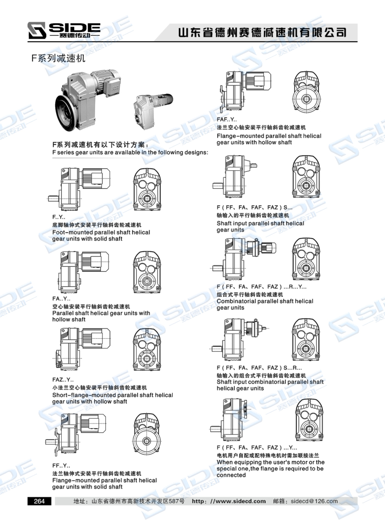 F系列減速機,結合國際技術要求制造,具有很高的科技含量,節省空間,可靠耐用,承受過載能力高,功率可達90KW以上,能耗低,性能優越,減速機效高達95%以上,振動小噪音低,節能高,選用優質鍛鋼材料,鋼性鑄鐵箱體,齒輪表面經過高頻熱處理,經過精密加工,確保軸平行度和定位的精度,這一切構成了齒輪傳動總成的減速機配置了各類電極,形成了電極一體化,完全保證了產品使用質量特性。
