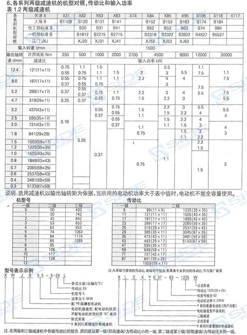2、輸入軸的轉(zhuǎn)速額定轉(zhuǎn)數(shù)為1500轉(zhuǎn)/分,在輸入功率大于18.5千瓦時建議采用960轉(zhuǎn)/分的6極電機配套使用。