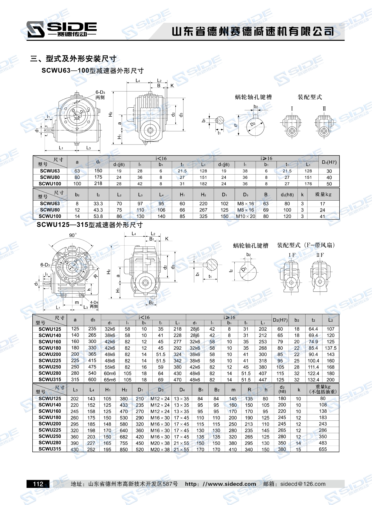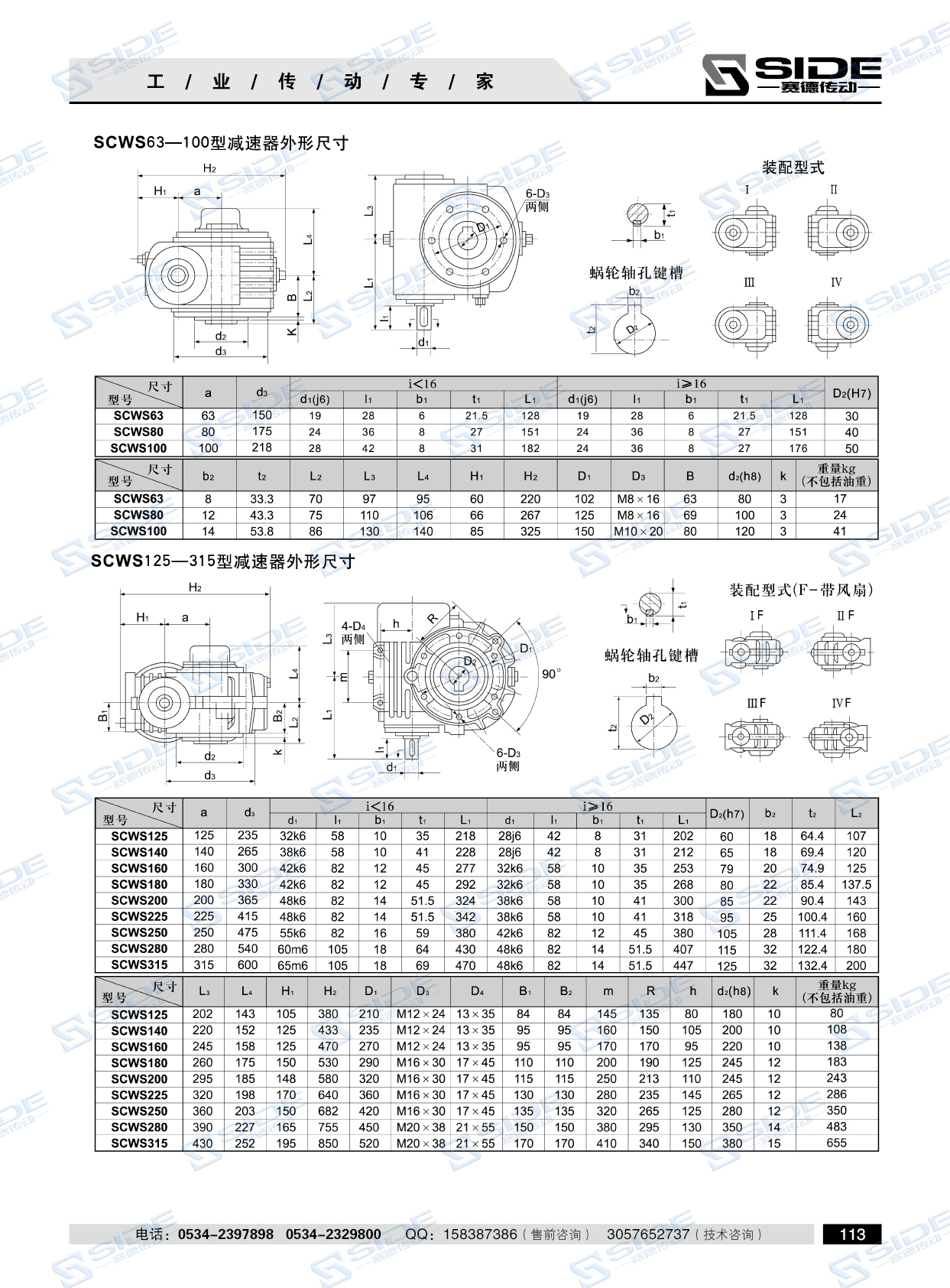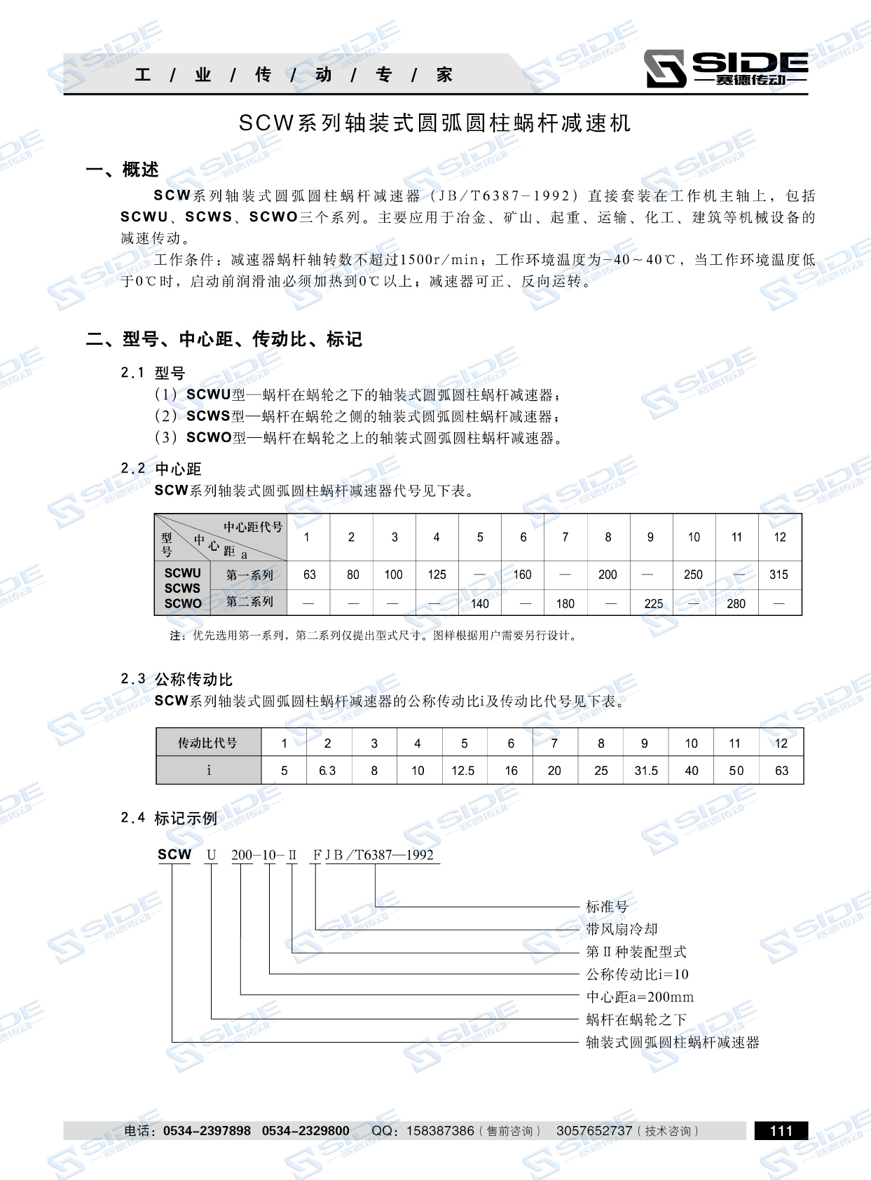 SCWS軸裝式圓弧圓柱蝸桿減速器(JB/76387一 1992)直接套裝在工作機主軸上,包括 SCwU,ScwS,SCWO三個系列。主要應用于冶金、礦山、起重、運輸、化工、建筑等機械設備的減速傳動。